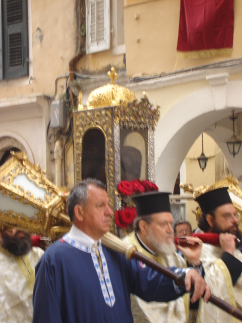 – în timpul procesiunilor religioase, Sfântul Spiridon este purtat în raclă stând în picioare;